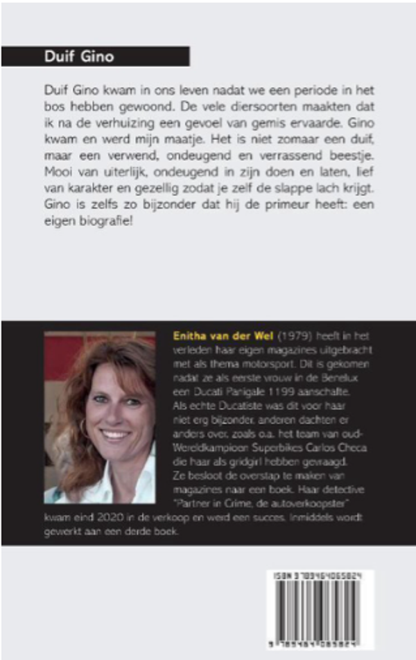 Duif Gino kwam in ons leven nadat we een periode in het bos hebben gewoond. De vele diersoorten maakten dat ik na de verhuizing een gevoel van gemis ervaarde. Gino kwam en werd mijn maatje. Het is niet zomaar een duif, maar een verwend, ondeugend en verrassend beestje. Mooi van uiterlijk, ondeugend in zijn doen en laten, lief van karakter en gezellig zodat je zelf de slappe lach krijgt. Gino is zelfs zo bijzonder dat hij de primeur heeft: een eigen biografie!